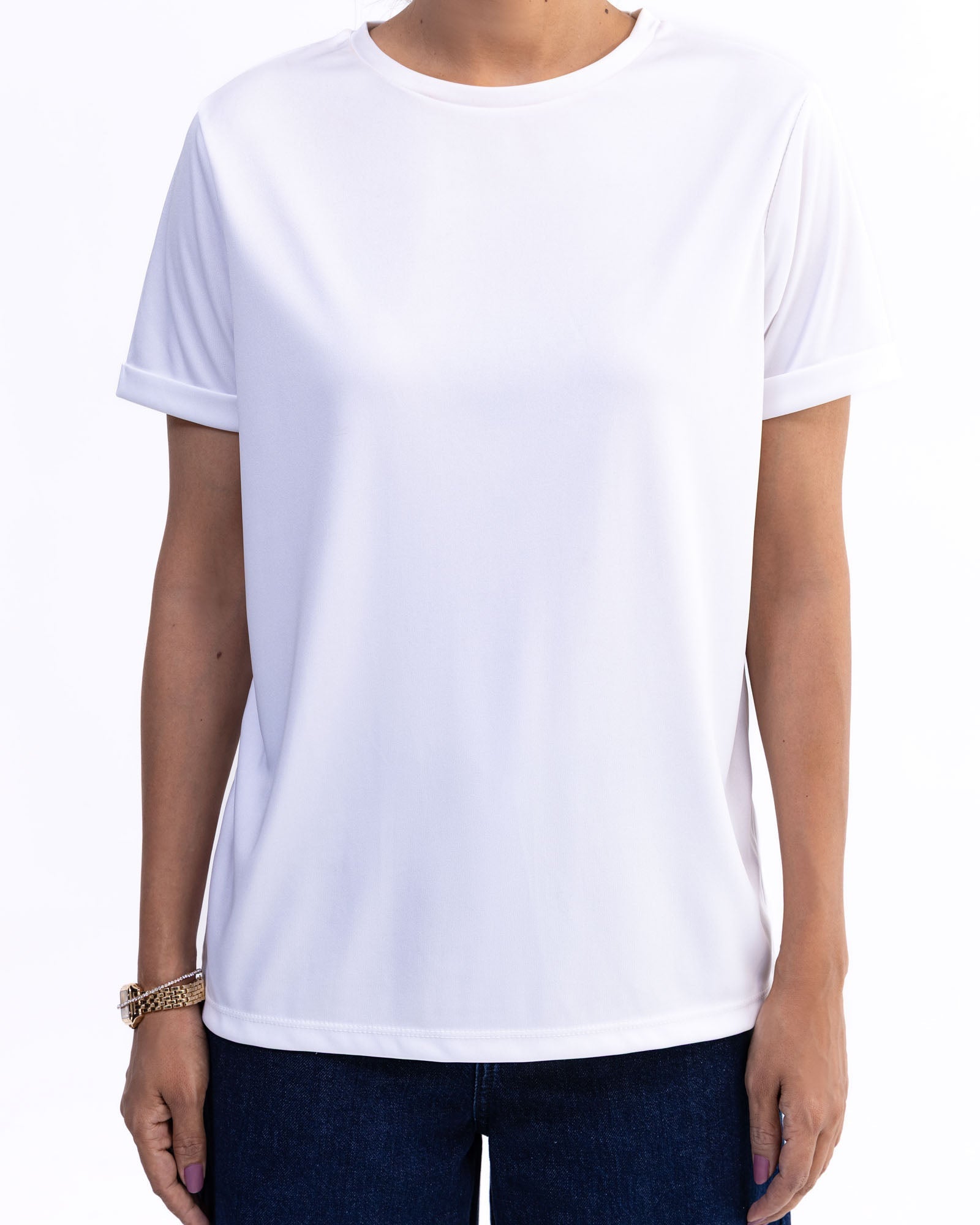 This women’s active wear plain tee is crafted from lightweight polyester, providing breathability and flexibility for everyday workouts or relaxed wear. Its simple design ensures a clean, versatile look with all-day comfort and moisture-wicking performance.